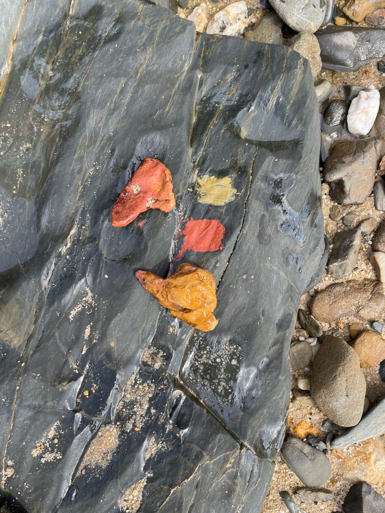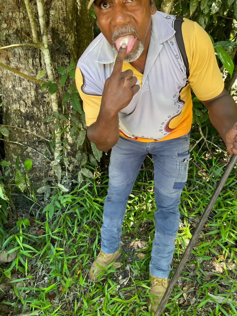 Our guide was taught all his survival skills from his grandfather. He taught us you can use the outer layer of coconut shells as an insect repellant. There is a certain tree when nicked with a rock – will drip white sap that can be used as aspirin. He also showed us a plant – if touched will insert hair like follicles into you skin with excruciating pain. You will need to go to a Dr and he / she will do a wax tear off of the area to pull the hairs out and relieve the pain. He also showed us the rocks that the natives used to use to paint their faces (see pictures below).